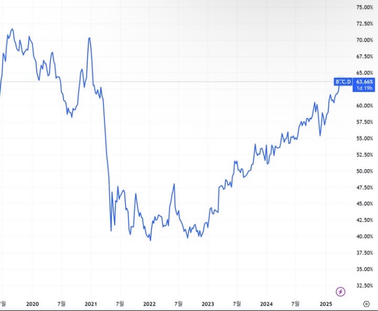 2025년에도 비슷할 것이며, 도미넌스가 50% 이상일 때 비트코인 중심의 시장, 40% 이하일 때 본격적인 알트코인 불장이 시작될 가능성이 있습니다.
