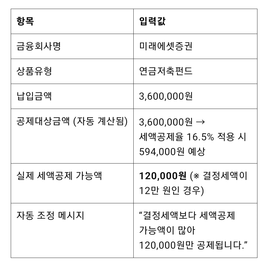 - 세액공제율은 13.2% (총급여 5,500만원 이하) 또는 16.5% (총급여, 4,000만원 이하 시) 자동 계산됩니다.